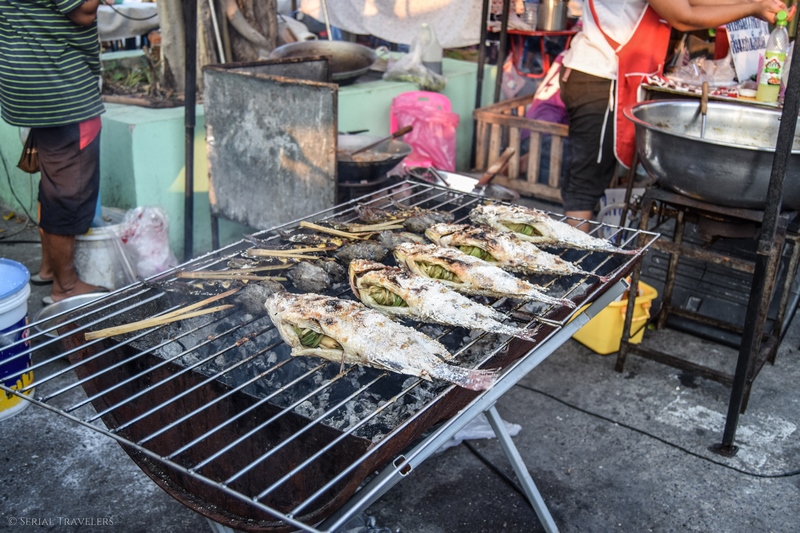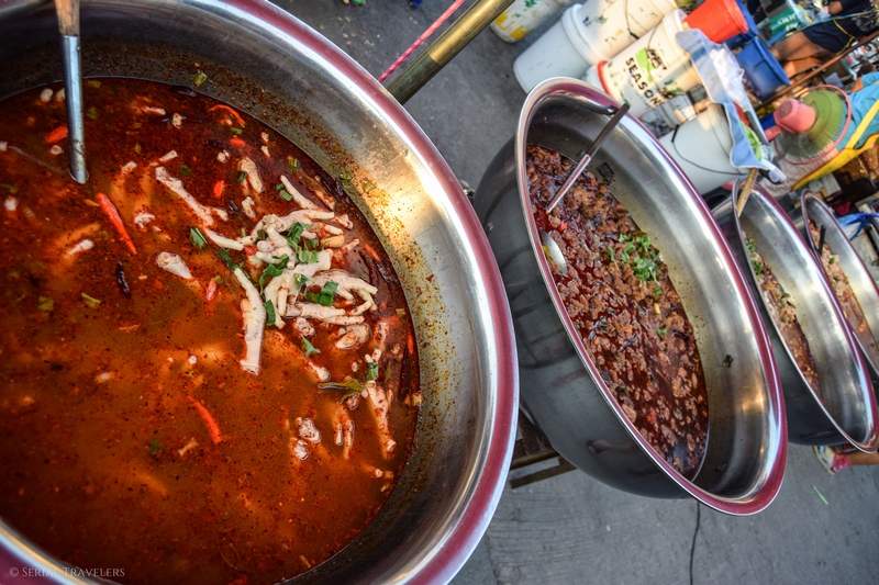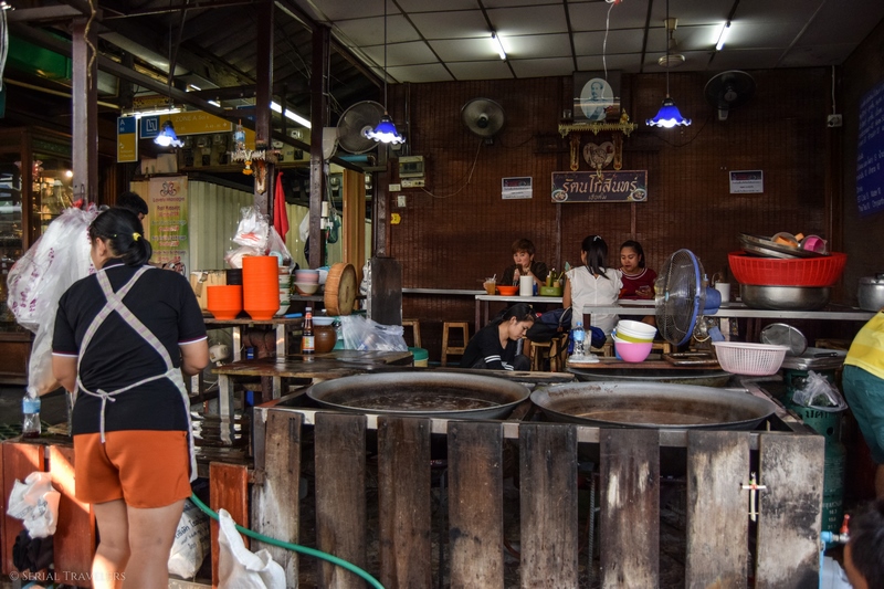 En arrivant à Panfa Leelard, on nous annonce que les marchés flottants n’ouvrent que les weekends ! On nous propose un tour sur les klongs à 200 THB soit plus de 10 fois le prix que nous venions de payer pour nous retrouver avec des troupeaux de Chinois. Non merci.