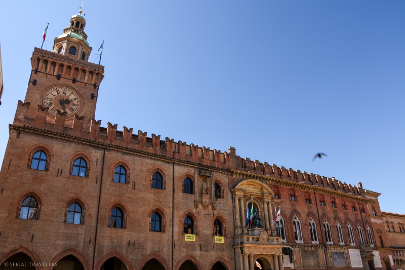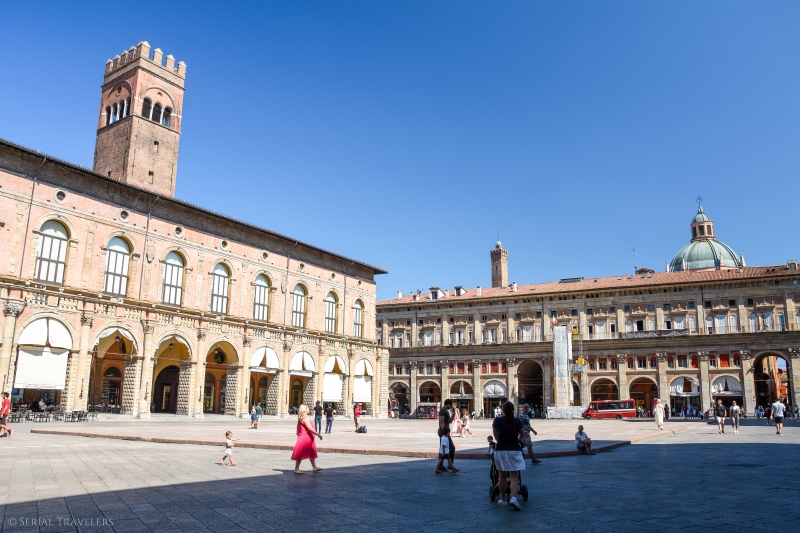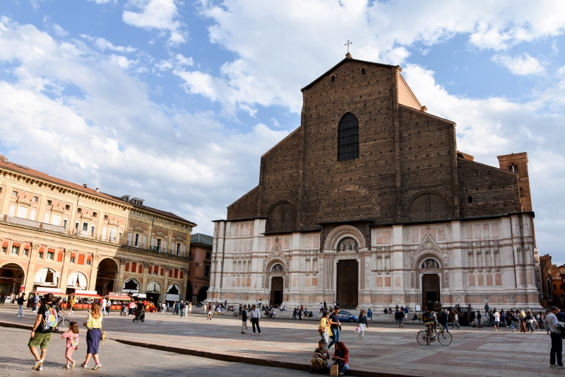 Après manger, nous atteignons la Piazza Maggiore en début d’après-midi. Piazza Maggiore (la Grande Place) est la principale place de Bologne où sont regroupés les édifices majeurs de la ville datant du Moyen-Âge, comme la Piazza delle Erbe à Vérone. On y trouve le Palazzo del Podestà (un bâtiment datant du XIIème siècle) surmonté d’une tour, en face de l’imposante Basilique San Petronio !