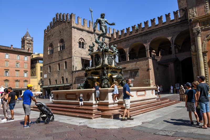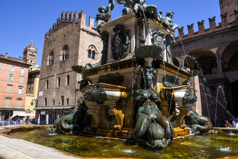 La Basilique San Petronio est d’ailleurs la basilique gothique en briques la plus volumineuse du Monde (258 000 m3) ! À l’Ouest de la place, se trouvent la Torre dell’Orologio (tour de l’horloge) et le Palazzo d’Accursio abritant l’hôtel de ville. Ces deux bâtiments donnent quant à eux sur la Fontana del Nettuno, une fontaine dédiée au dieu romain Neptune.