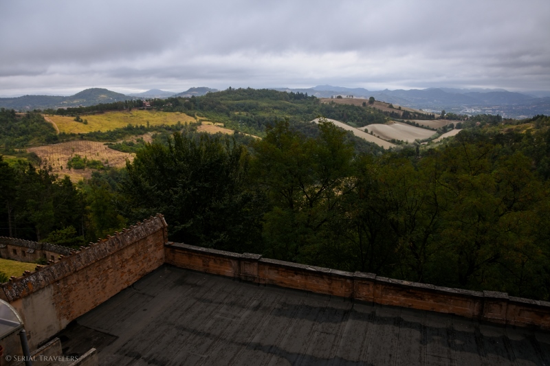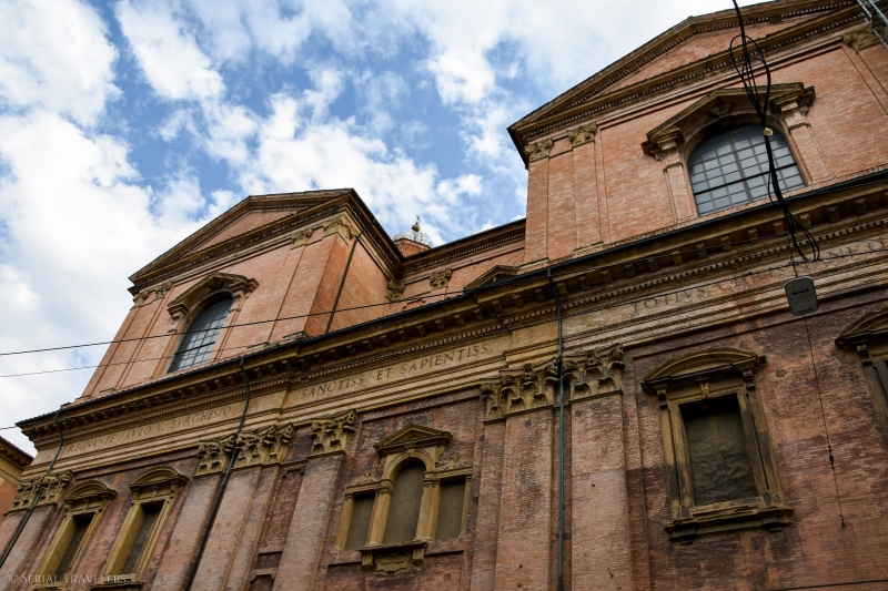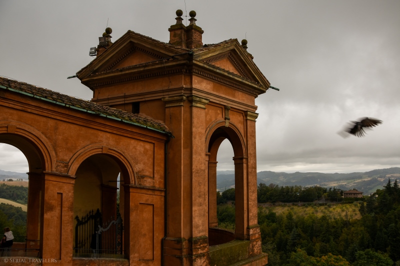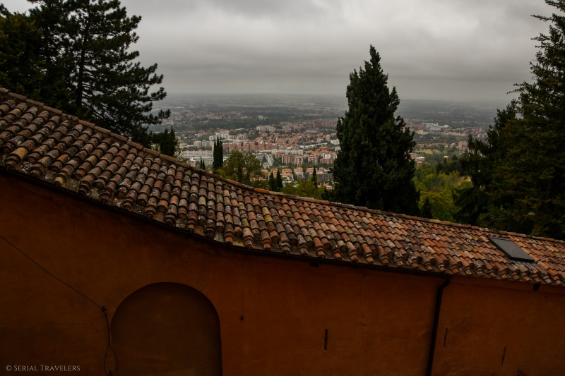 En cette fin de matinée pluvieuse, nous arrivons au sommet du sanctuaire de la Madone de San Luca vers 11H30. Cette basilique est située au sommet de la colline du Monte Guardia, au Sud-Ouest du centre-ville historique. Le sanctuaire est célèbre pour sa procession annuelle où l’icône de la Vierge Marie – peinte par Saint Luc -, est amenée depuis le centre-ville jusqu’à la basilique. Afin de protéger l’icône religieuse durant la procession, une série 666 arches fut construite entre 1674 et 1793. Il s’agit du Portico di San Luca, une gigantesque arcade couverte mesurant 3,5 km !