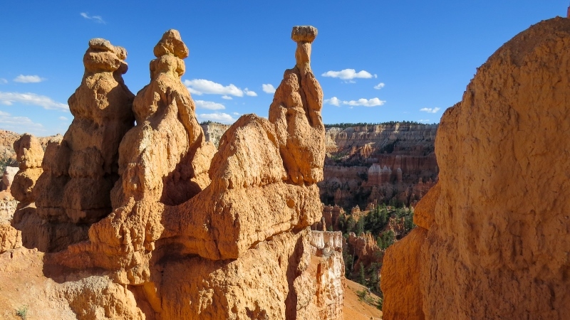 Ces colonnes rocheuses plutôt friables, d’origine sédimentaire ou volcanique, sont coiffées d’une roche de nature différente, beaucoup plus résistante à l’érosion. De ce fait, les cheminées de fée présentent souvent une forme phallique… On retrouve des cheminées de fée un peu partout sur la planète, mais celles de Bryce Canyon ou de Cappadoce sont les exemples les plus connus. Aussi, les formations géologiques uniques de Bryce Canyon ont amené le NPS (National Park Service, qui gère les parcs nationaux) à élire Bryce Canyon NP comme étant le plus beau parc national des Etats-Unis !
