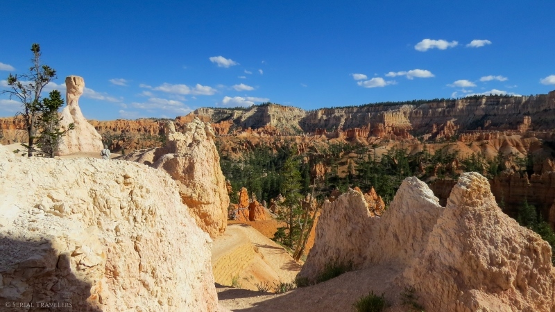 Revenus à Sunrise Point vers 11H20, nous démarrons la randonnée du Queens Garden Trail, combinée au Navajo loop. Cette combinaison de deux randonnées distinctes est la marche la plus populaire du parc : on descend dans l’amphithéâtre par Sunrise Point et on remonte sur la rim par Sunset Point pour voir des paysages différents à la descente et à la remontée 🙂 La descente se fait assez facilement en lacet jusqu’au cœur de l’amphithéâtre et permet d’approcher d’un peu plus près les fameux hoodoos, qui se dressent fièrement devant nous. En descendant dans le canyon, nous ferons également connaissance avec les fameux chimpmunks, une sorte d’écureuils très peu farouches.