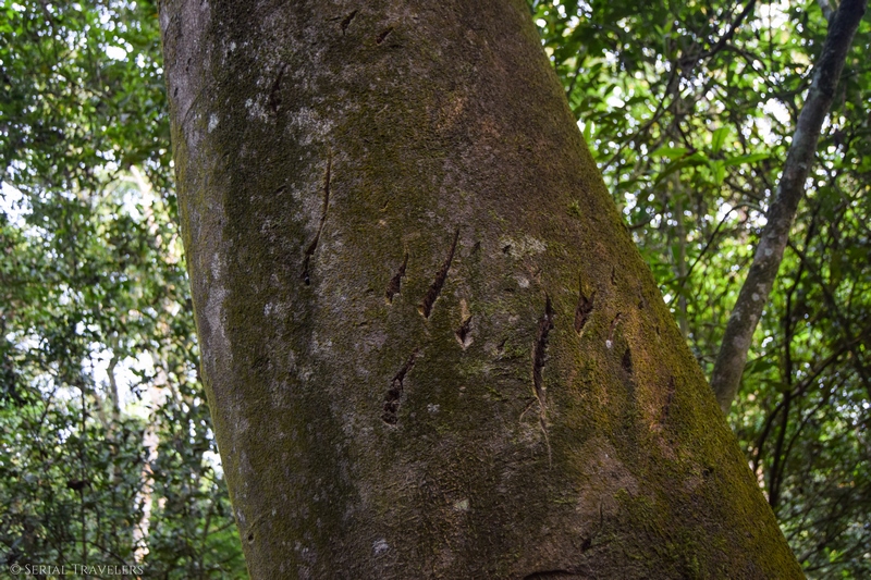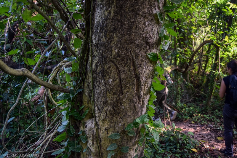 Nous marchons ensuite à l’affût de toutes les empreintes au sol et sur les arbres… Le guide renifle les feuilles, analyse les empreintes et les excréments, écoute en positionnant ses mains pour faire écho et ouvre grand les yeux.