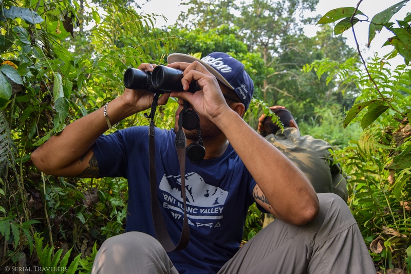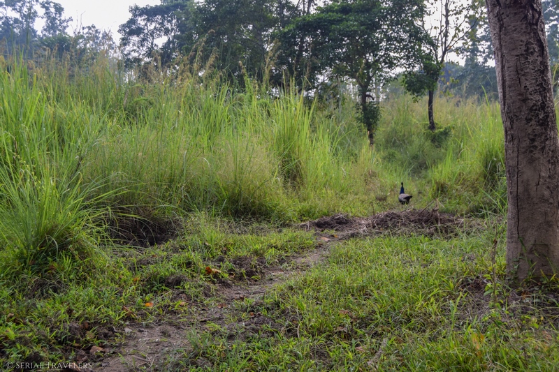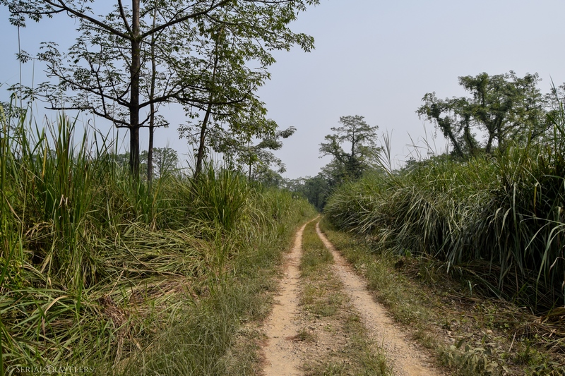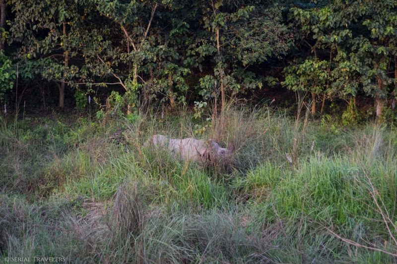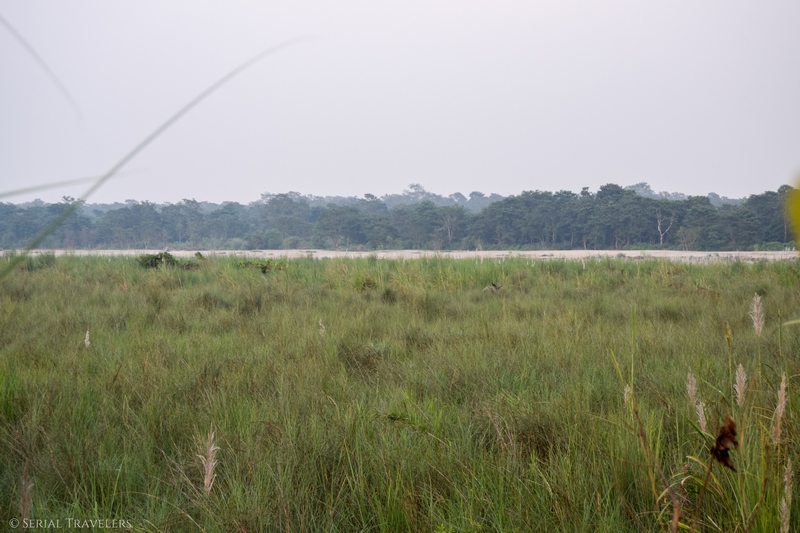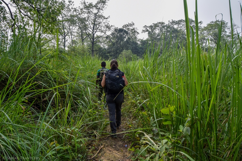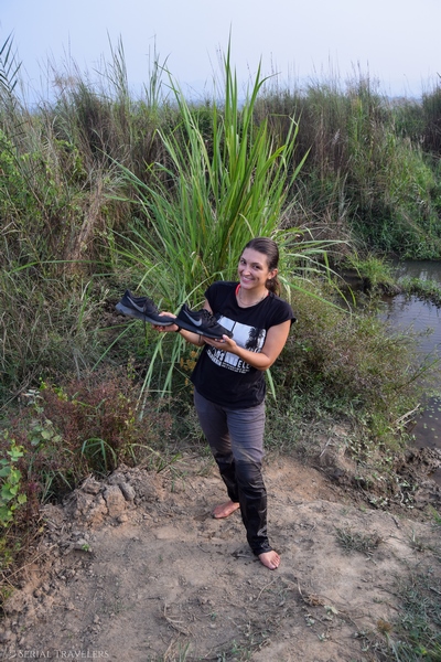 Pour l’anecdote, un tigre a dévoré la jambe d’une femme un mois auparavant, deux pêcheurs ont perdu la vie à cause des crocodiles cette même année… Les ours peuvent surgir d’un buisson et les rhinocéros peuvent vous charger à tout moment… Pour nous défendre : nos guides, leur bâton et notre chance !
