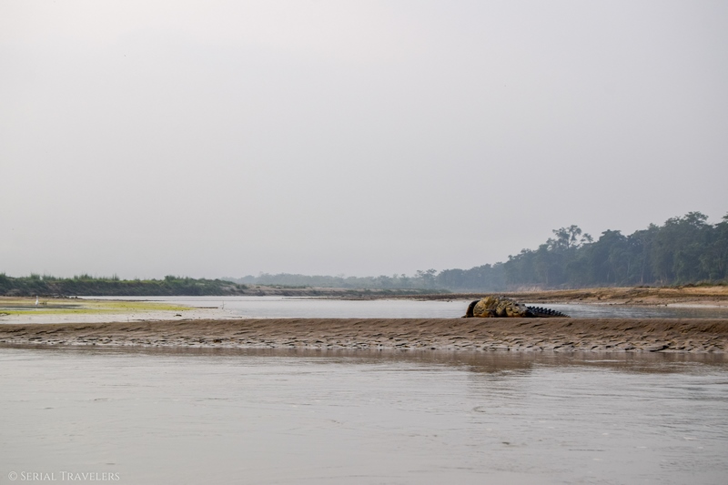 En fin de journée, Tarim, qui travaille à l’hôtel et qui est venu nous chercher à l’arrêt de bus quelques heures plus tôt, nous propose de nous emmener aux abords du parc pour une courte marche. Malgré la fatigue et le manque de motivation, nous lui emboîterons le pas et ne le regretterons pas ! À seulement quelques minutes de marche, on tombe directement sur un rhinocéros, des crocodiles et autres gavials qui se prélassent au soleil le long de la rivière !