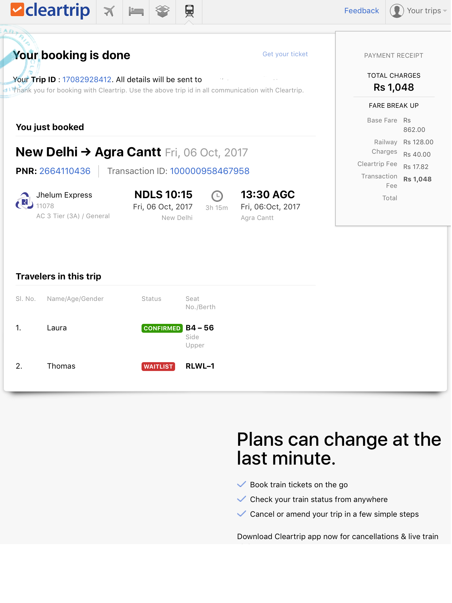 A titre d’exemple ci-dessus, pour notre première réservation, Laura a obtenu la dernière place disponible et Thomas s’est retrouvé sur la Waitlist à la place n°1 sur le trajet New Delhi – Agra. C’est le train que nous avons réservé en premier (un mois et demi à l’avance) car il permet d’atteindre… le Taj Mahal ! Cleartrip nous a envoyé un mail deux semaines plus tard pour informer que Thomas n’était plus sur waitlist mais dans un wagon différent. Après négociation sur place avec les autres passagers nous avons finalement pu être dans le même wagon 🙂