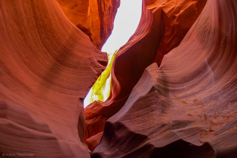 Antelope Canyon fait clairement partie des incontournables lors d’un roadtrip dans l’Ouest américain ! Découvert en 1931 par une jeune bergère Navajo (à prononcer Navaho), Antelope Canyon tire son nom des nombreux pronghorns (antilope d’Amérique) qui peuplaient autrefois la région du canyon. Ce corridor est dorénavant l’un des paysages naturels les plus connus et les plus photographiés au Monde ! Cette curiosité géologique est en fait un slot canyon, c’est-à-dire un canyon long et étroit, puisqu’il s’agit d’une faille d’à peine quelques mètres de large, creusée dans le sol !