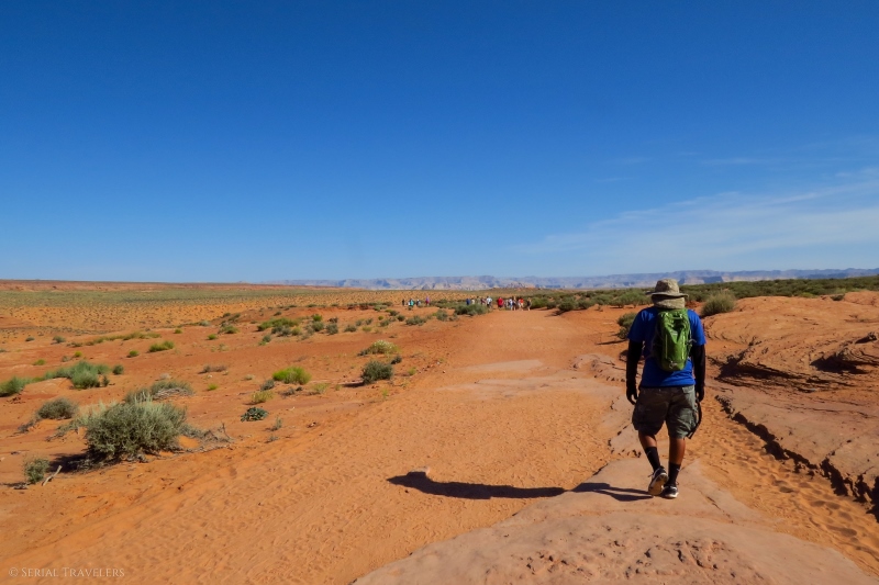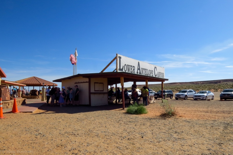 Mardi 7 juin 2016, nous nous levons encore une fois de bonne heure pour sortir de notre hôtel de Page et prendre un petit-déjeuner à l’américaine dans un restaurant Denny’s de Page. Ce matin-là, nous avons rendez-vous à Lower Antelope Canyon à 7H50 pour notre briefing avec Ken’s Tour, devant la petite cabane située à l’entrée du site. À 8H20, notre guide Navajo nous emmène à pied jusqu’au seuil d’Antelope Canyon, matérialisé par une faille dans le sol.