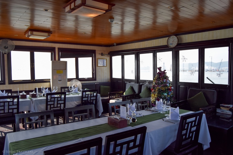 Arrivés dans notre cabine, nous sommes agréablement surpris par le confort et le luxe de la cabine, tout à fait conformes à la description qui nous avait été donnée par Bishnu de l’agence Sinh Travel Café à Hanoï ! Boiseries, salle de bain en marbre et même climatisation (bien inutile par ce froid, on en convient) font notre bonheur 🙂