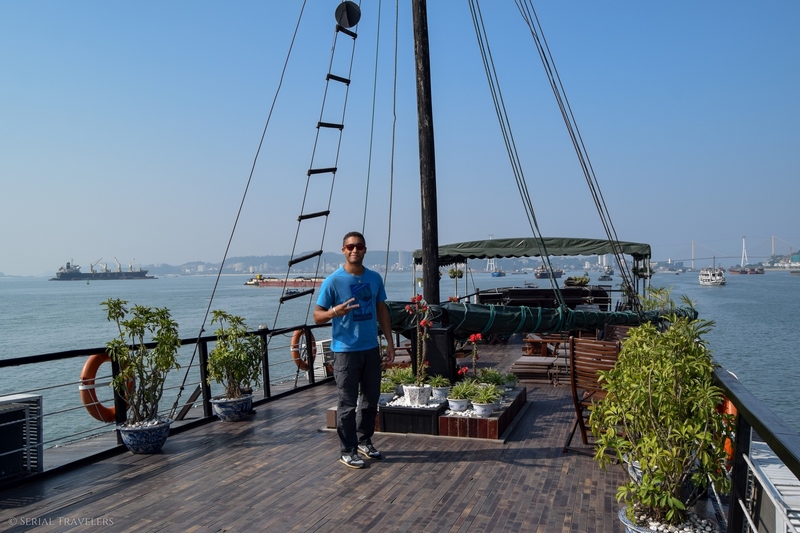 À peine sortis du minibus, nous sommes pris en charge par la responsable de la croisière qui supervisera le déroulement de notre séjour sur la jonque durant ces deux jours, malgré un anglais assez approximatif… Nous embarquons donc joyeusement sur le Garden Bay, qui ne comptera que 14 passagers à bord pour cette croisière 🙂