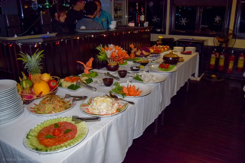 Passées la découverte et l’installation dans la cabine, nous aurons droit à un repas très raffiné avec les pains de sucre en toile de fond… C’est cher donc, mais à la hauteur des prestations affichées !