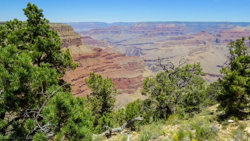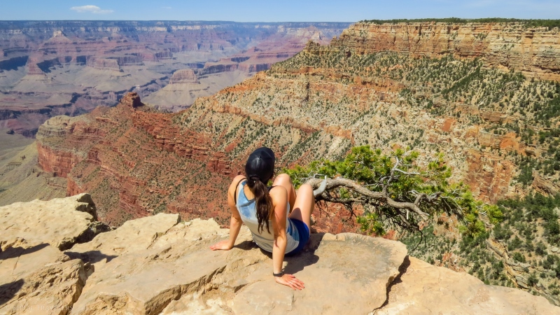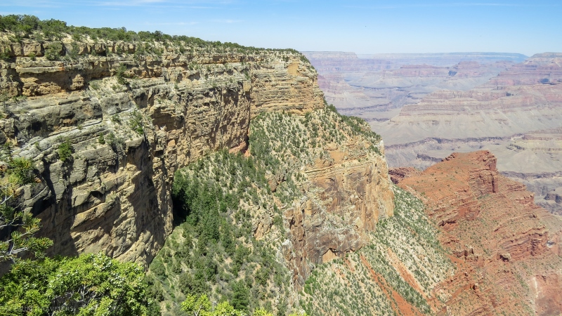 Nous démarrons notre marche le long de la corniche Sud, au niveau du Bright Angel Trailhead, un sentier qui consiste à descendre dans le fond du canyon. Cette célèbre randonnée, longue et éprouvante, nécessite 2 jours de marche ! Depuis Trail Viewpoint, on peut donc observer les lacets du Bright Angel Trailhead ainsi que les installations de Grand Canyon Village, perdues au milieu de la forêt de pins qui peuplent le plateau de la rive Sud.