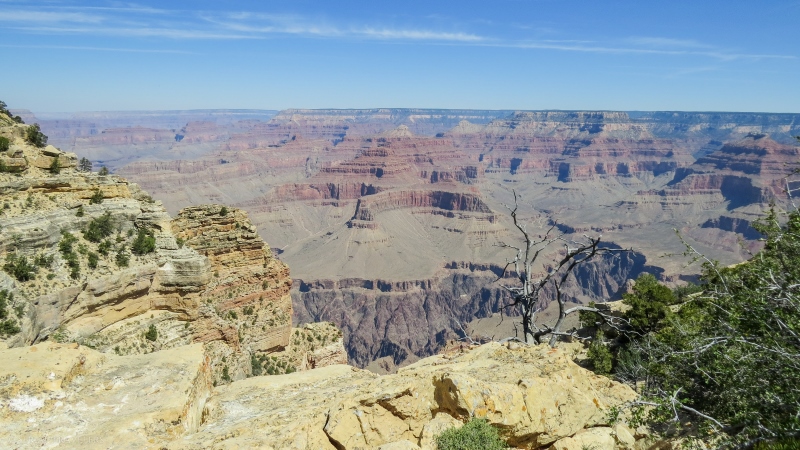 Yaki Point, tout comme Hopi Point plus à l’Ouest, fait partie des plus beaux spots du parc ! D’ici, on peut voir toute l’immensité du canyon dans toute sa largeur ! C’est ce qui explique également l’affluence très importante de ce point de vue, inaccessible aux véhicules particuliers. Il faut garer sa voiture au Visitor Center à Grand Canyon Village et prendre la navette orange.