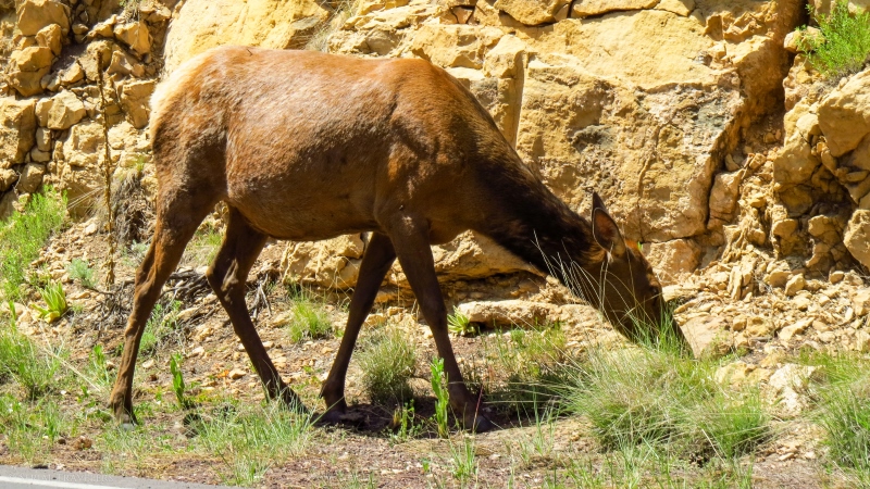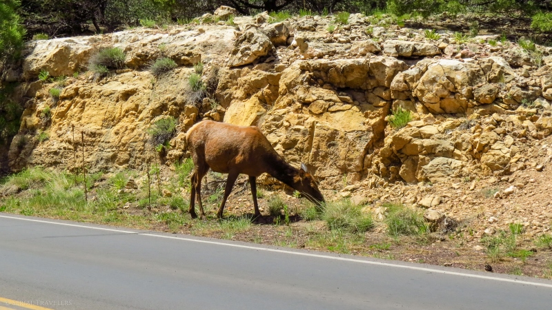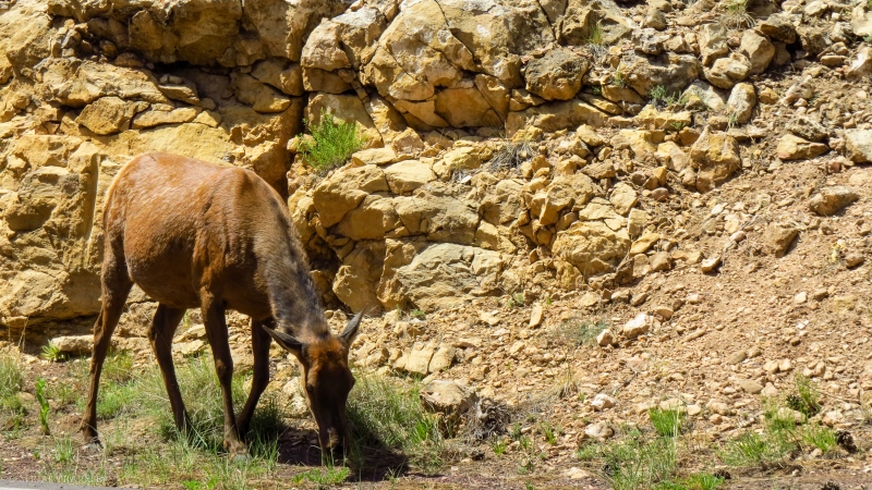 Nous repartons ensuite en navette vers le Maswik Lodge aux environs de 12H30, pour manger une pizza au Bright Angel, un restaurant de Grand Canyon Village. En retournant vers la voiture après manger, nous aurons la chance de tomber nez-à-nez avec un cerf mulet (mule deer en anglais) ! Ce cervidé vit dans les forêts de l’Ouest de l’Amérique du Nord, et il n’est pas rare de le croiser dans les alentours du Grand Canyon. D’ailleurs, celui-là nous laissera nous approcher assez près de lui 🙂