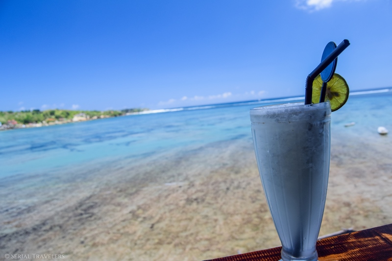 Lundi 21 août 2017, suite à notre matinée de snorkeling pour observer les raies Manta, le personnel de l’agence nous dépose en scooter une nouvelle fois chacun notre tour à notre homestay. Nous partons ensuite en direction de l’Ouest de l’île pour manger dans un excellent warung, qui offre une vue exceptionnelle sur le détroit séparant les îles de Nusa Lembongan et Nusa Ceningan.