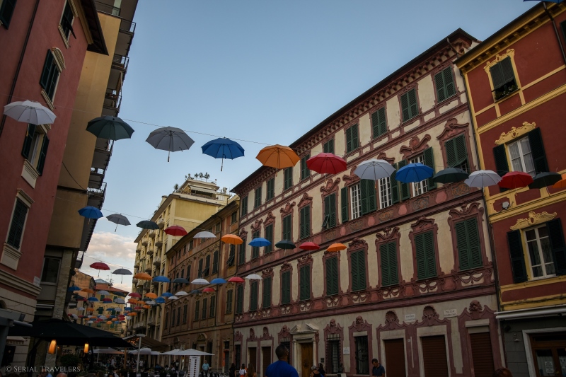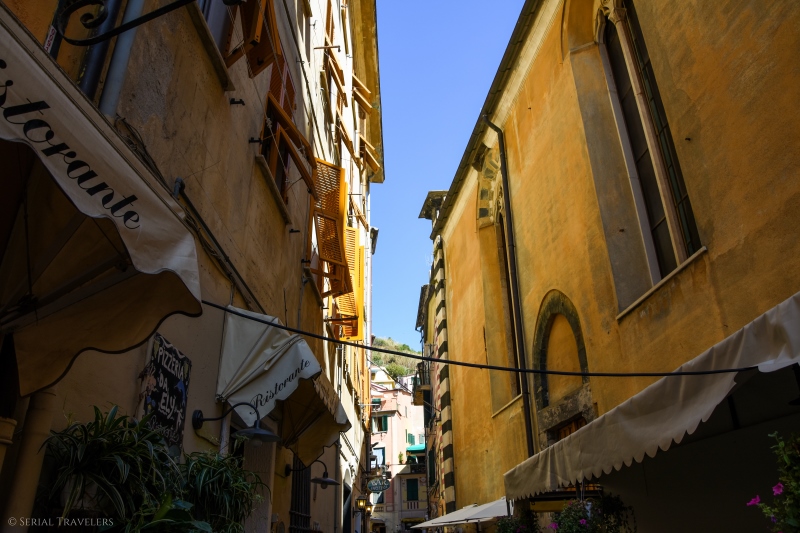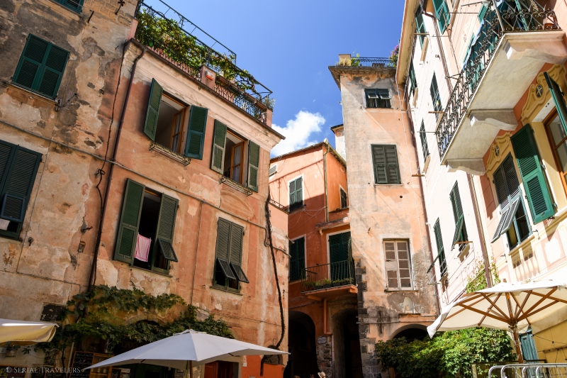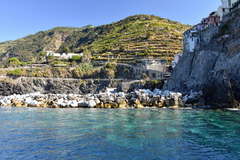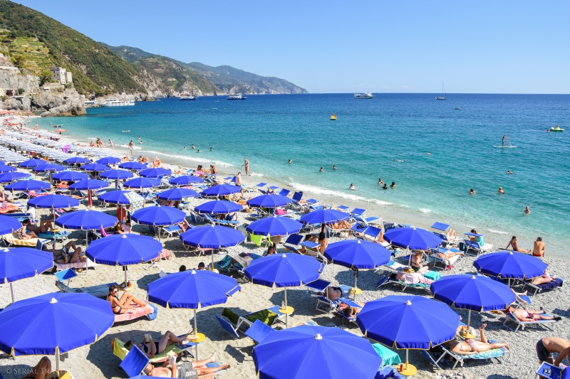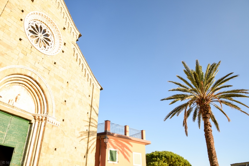 Après 1H30 de traversée tranquille en longeant la côte, nous débarquons sur l’embarcadère de Monterosso al Mare peu après 11H ce matin. Des Cinque Terre, c’est le village le plus occidental et également le plus peuplé, avec près de 1 400 habitants. Flanqué de petites ruelles colorées, on retrouve de nombreux bâtiments aux façades rayées de noir & blanc, typiques de l’architecture génoise. Monterosso est aussi connue pour son immense plage de sable blanc, la Fegina, qui s’étire sur toute la baie avec ses parasols bleus et ses chaises longues.