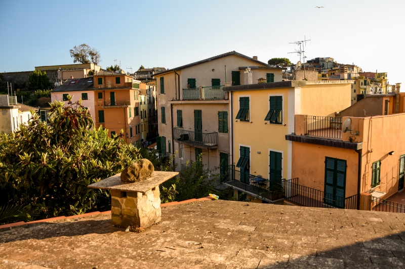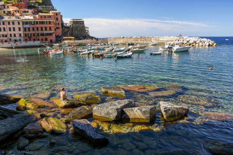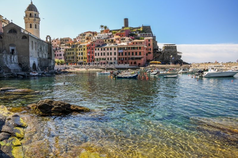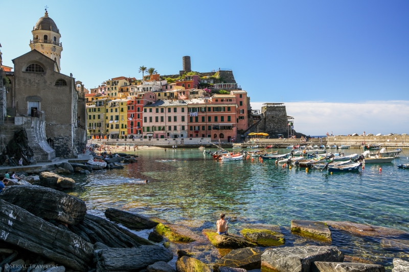 Vers 17H, Thomas atteint Vernazza, où il prendra le temps de flâner dans les ruelles tout en dégustant une bonne glace à l’italienne ! Perché sur son promontoire rocheux, avec ses maisons bigarrées lovées autour de son petit port de pêche et sa grande place, Vernazza est sans aucun doute le plus beau village des Cinque Terre ! Il fait d’ailleurs partie du club très sélect des 100 plus beaux bourgs d’Italie, rien que ça 🙂 ! Dominé par le château Doria (tour présente en arrière-plan) et entouré de vignobles en terrasses, Vernazza reste authentique malgré son attraction touristique certaine !