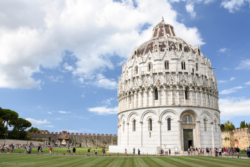 À notre arrivée sur la Piazza dei Miracoli, nous tombons sur une foule nombreuse et compacte… L’endroit est noir de monde et la déception assez grande ! Il y a tellement de monde que notre séance photos est fortement perturbée… Tant bien que mal, nous trouvons un bout de bitume libre et essayons de faire quelques photos quand nous sommes volontairement importunés par un couple de touristes totalement irrespectueux ! Ils n’hésitent pas à passer devant notre objectif à plusieurs reprises et restent intentionnellement immobiles sur nos photos…