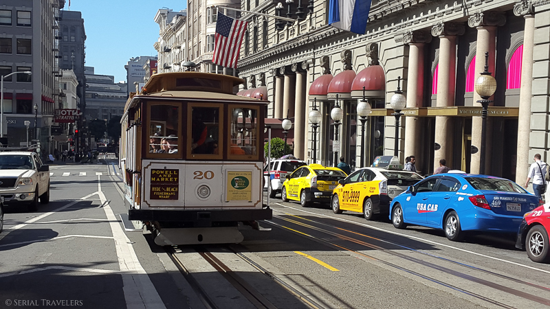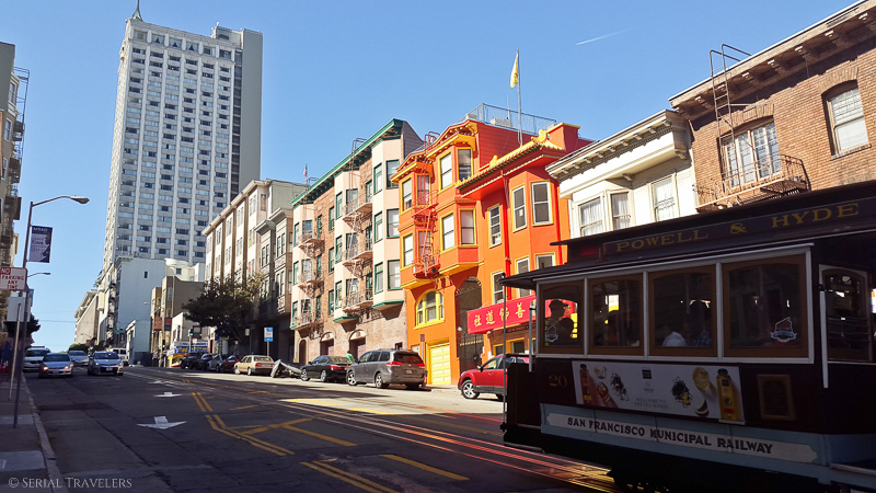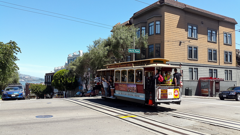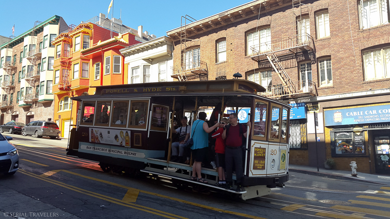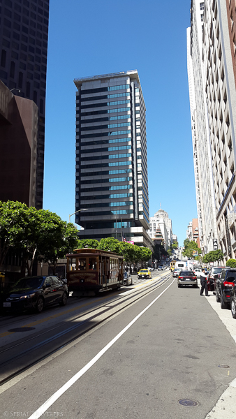 Chinatown : nous attrapons le cable-car Powell & Hyde Sts au niveau de l’arrêt situé devant l’hôtel Westin St. Francis et hop, c’est parti pour une ballade de 10 minutes sur les collines inclinées de la ville ! Serial astuce : si vous le pouvez, essayer de vous mettre debout sur les marche-pieds extérieurs, vous pourrez prendre des photos et les sensations sont sympas !