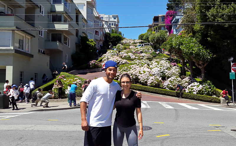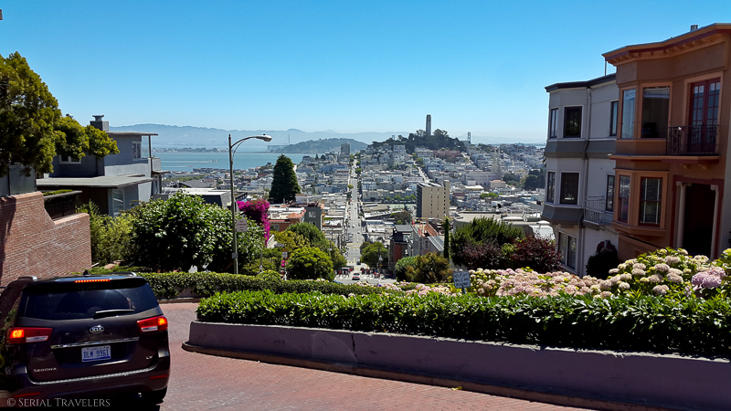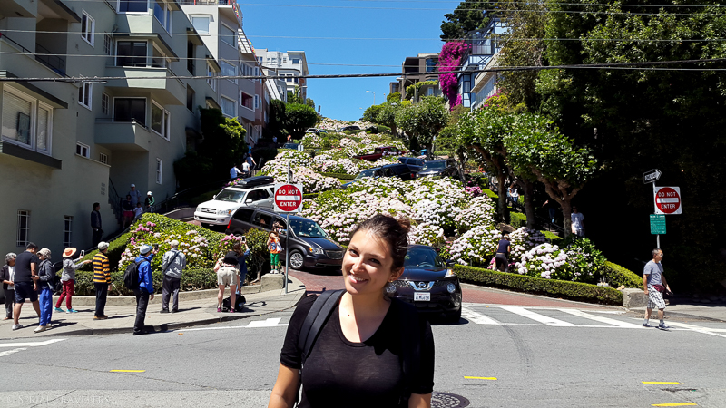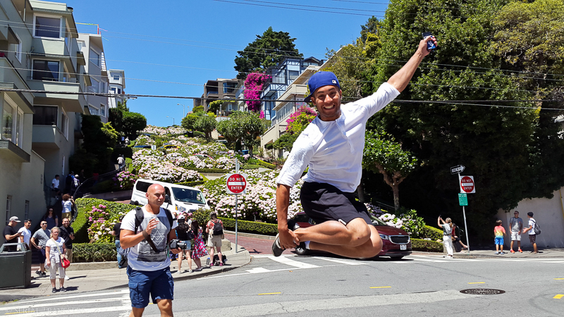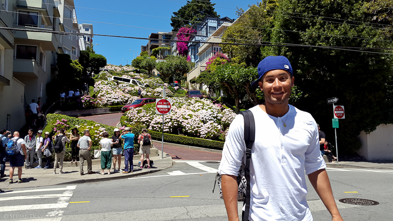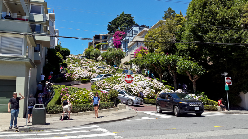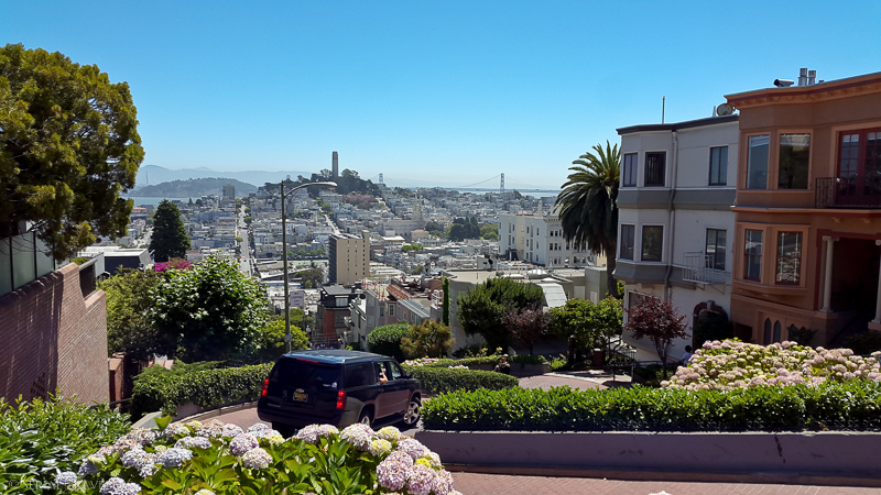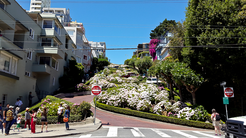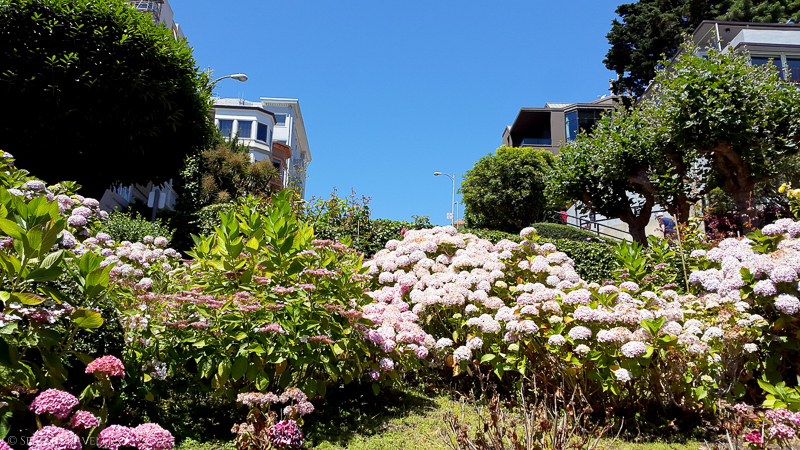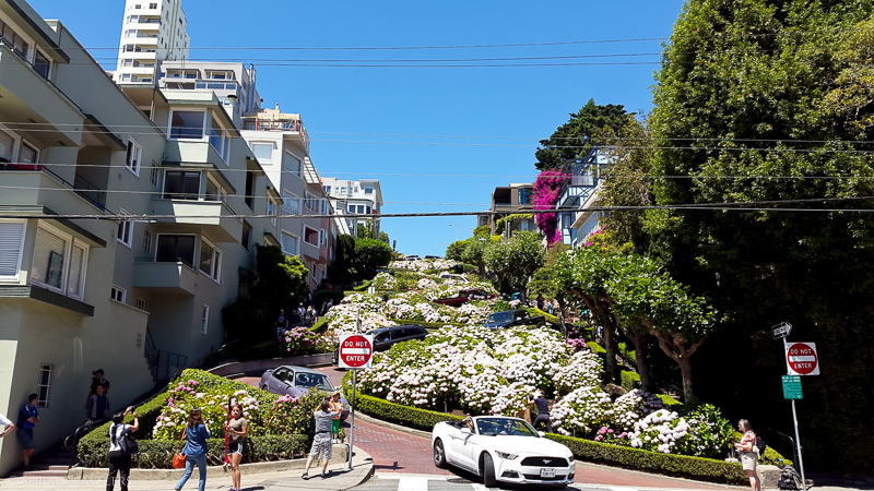 Cette célèbre rue est la plus tortueuse et la plus pentue de San Francisco (pente à 26% avant l’aménagement des virages) ! Du fait de sa notoriété, la rue est prise d’assaut par nombre de touristes, que le beau temps et le floraison exceptionnelle auront attiré sur les lieux comme des mouches !