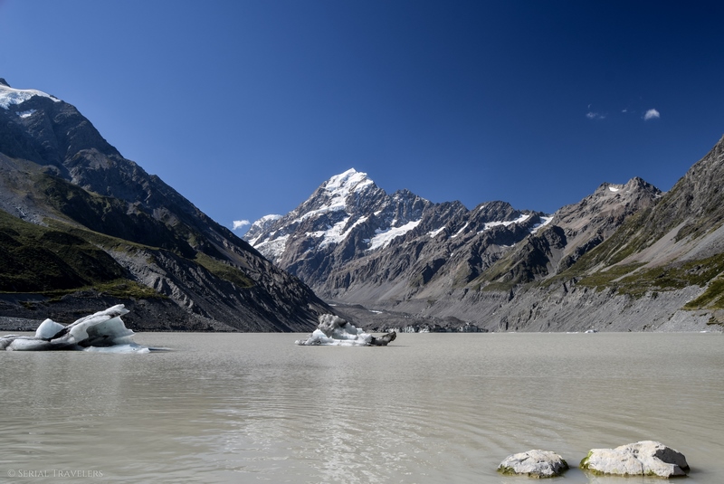 En effet, cette marche se fait tout en douceur (très peu de dénivelé) et permet d’approcher Aoraki / Mont Cook de très près : la randonnée se termine au pied du lac Hooker, un lac alimenté par le glacier du même nom. L’une des particularités de ce lac est sa température glaciale ! Thomas tentera même un plongeon dans cette eau à 2°C avec succès, mais échouera à atteindre l’un des icebergs flottants sur le lac, à la suite de leur détachement du glacier.