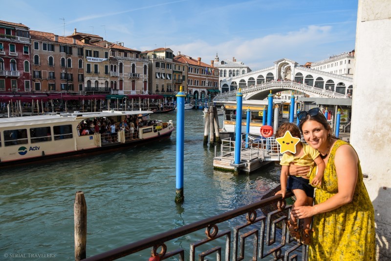 Il existe un immense réseau de ponts traversant les centaines de canaux (appelés « rio » au singulier et « rii » au pluriel) de Venise. Quand on est un adulte en pleine forme, aucun soucis. Par contre, ça se gâte en étant enceinte (Laura a donné ^^) ou lorsqu’on doit porter bébé dans sa poussette (presque 2 ans et 11 kg sur la balance, Thomas a donné ^^). Il faut donc s’armer de courage dans ces 2 situations, car les journées sont éprouvantes, avec parfois plus de 40 ponts à traverser dans une même journée 🙂