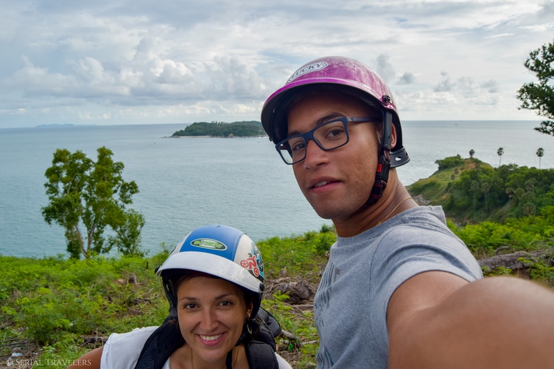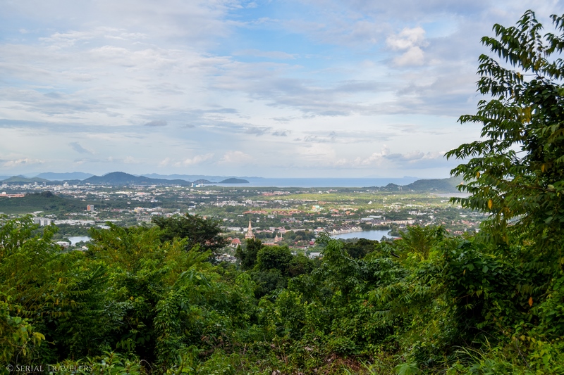 Vers 17H, on décide de se rendre au Big Buddha, mais on réussit à louper l’embranchement sur la route principale ! On tourne donc dès que possible dans la même direction et on finit par arriver sur un chemin serpentant sur une colline très pentue, surplombant Phuket ! Le point de vue est vraiment sympa, mais pour y arriver c’est une vraie galère : à 2 sur un scooter peu puissant, on se traîne à moins de 20 km/h dans la montée. Et on n’est pas encore au bout de nos peines…