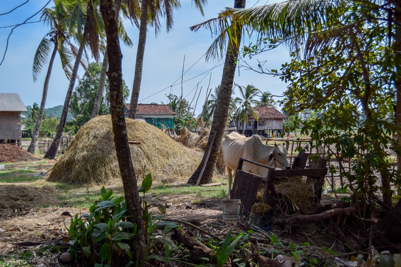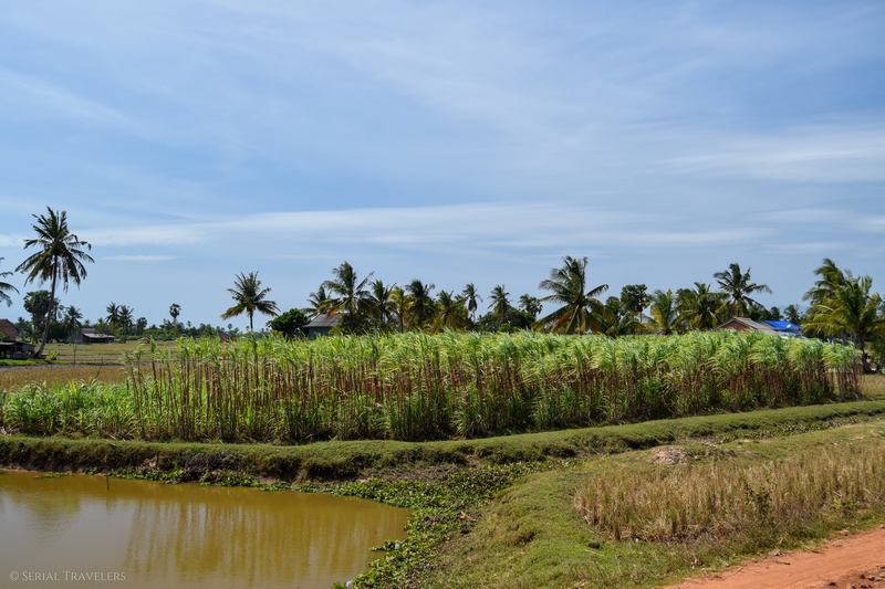 Nous filons ensuite à travers la très jolie campagne à l’extérieur de la ville, où l’on trouve de nombreux palmiers de Palmyre (palmier à sucre) et des vaches broutant dans les rizières. La fleur de sel récoltée au niveau des marais salants de Kep est également un produit culinaire raffiné et apprécié dans le monde entier.