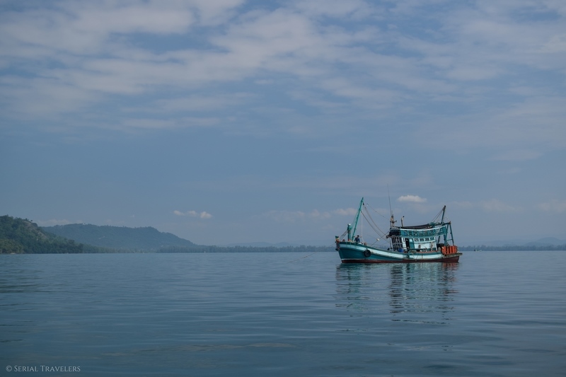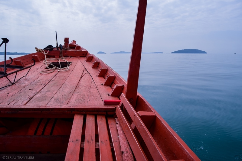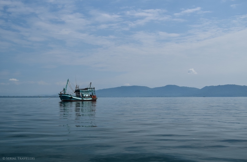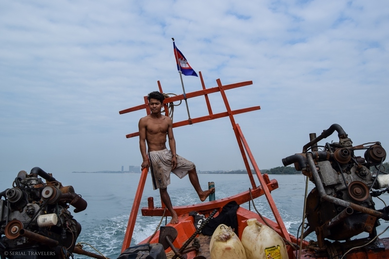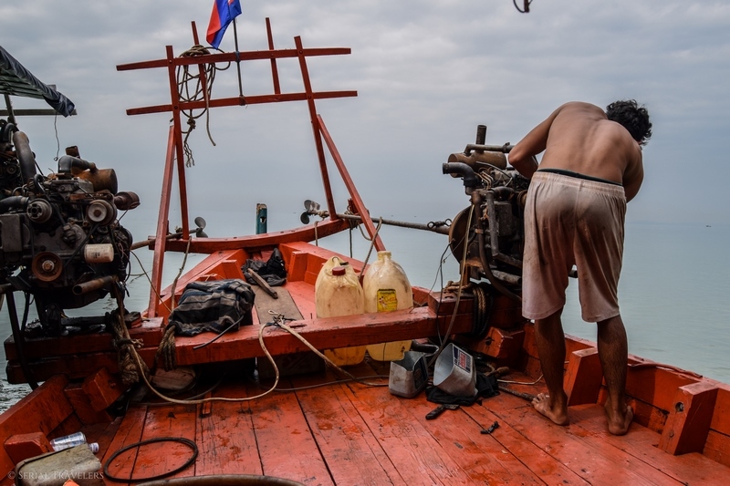 Et ce n’est pas fini ! Le bateau étant censé décoller à 9H30, nous arrivons pile à l’heure au niveau de l’embarcadère de l’agence n°2 à Otres Beach 1 (celle à qui appartient le bateau). Mais c’était sans compter sur les problèmes mécaniques du bateau ! En effet, il faudra quasiment une demie heure au jeune capitaine pour réparer le moteur de l’embarcation… Avant que celui-ci ne lâche de nouveau en pleine mer ! Nous terminerons donc la traversée avec un moteur sur deux, priant pour que le dernier ne casse pas à son tour !