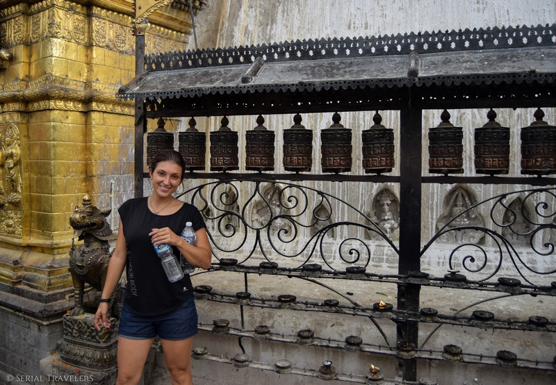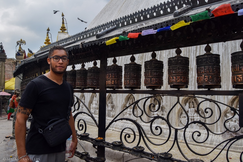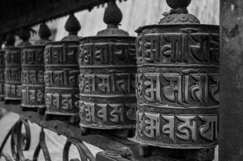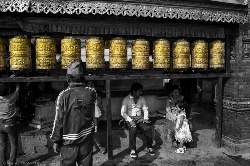 Contrairement aux stupas que nous avions visité au Sri Lanka (Anuradhapura, Mihintale), celui-ci, et c’est une tradition au Népal, est surmonté d’une tour dorée sur laquelle les yeux de Bouddha ont été peints dans les 4 directions. Nouveauté également par rapport au Sri Lanka : les moulins de prière ! Ce sont des moulins verticaux placés tout autour de la structure du stupa, que les fidèles font tourner chacun leur tour en faisant le tour du stupa.