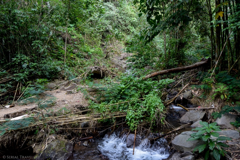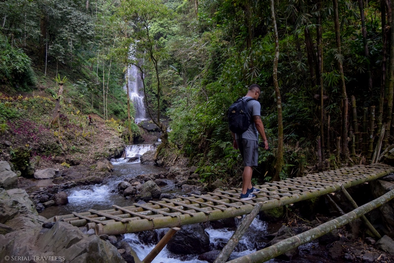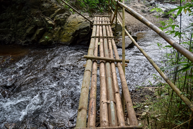 Une fois les cascades trouvées, faites attention à vos affaires qui seront très vite trempées. Une protection d’appareil photo n’est pas du luxe ! Si vous voulez vraiment prendre l’eau, il est possible de se baigner dans les cascades, a vos risques et périls. Nous avons préféré rester sur terre et c’est parfois assez sport entre les marches très hautes et les sentiers glissants. Un pont a d’ailleurs été détruit par de fortes pluies il y a quelques mois, il vous faudra traverser la rivière par un petit pont en bambou.