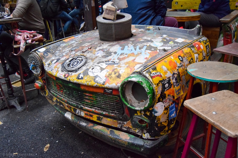 Imaginez un gigantesque bâtiment transformé en squat, le tout rempli avec des tas d’éléments de récupération, du bric et du broc : vous obtiendrez une vision assez fidèle de ce qu’est un bar de ruines… Très populaires auprès de la jeunesse de Budapest, les bars de ruines sont des bars créés dans des endroits totalement désaffectés, et il faut le dire, complètement pourris ! Nous avons fait un tour dans le plus connu de tous, Szimpla Kert, mais n’y avons pas pris de consommation car l’endroit était un peu trop « en ruines » à notre goût 🙂
