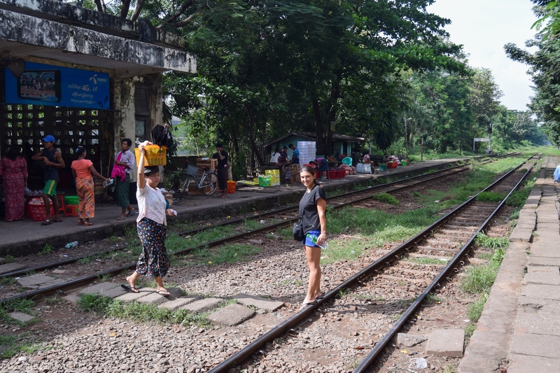 Nous partons donc en direction de la gare centrale de Yangon à pied depuis le quartier colonial pour découvrir le train circulaire. Cette ligne de 46 kilomètres, créée par les Britanniques au XIXè siècle, forme une boucle autour de la ville de Yangon. C’est un peu l’équivalent de notre métro ou notre RER avec une vitesse très lente et des trains très vieux… La flotte ferroviaire est de seconde main, importée du Japon entre autres.