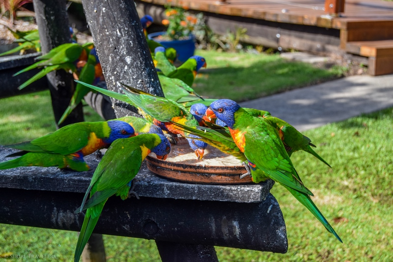 - Des loriquets à tête bleue extrêmement beaux et colorés, mais très bruyants, à Airlie Beach