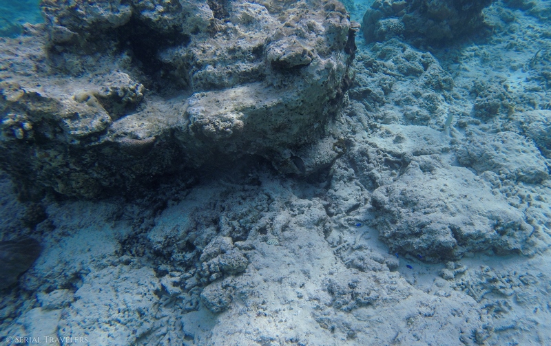 Accessible à tous les snorkelers oui, mais pas tous les marcheurs ! La plage de galets est difficilement supportable pour les pieds, alors si vous le pouvez, investissez dans des chaussures aquatiques. Nous n’avons vu ni loueur ni vendeur sur place, mieux vaut donc les acheter avant de partir. Au delà de la plage, nous avions lu que la mer était calme à cet endroit et bien ce jour-là ce n’était pas vraiment le cas. Cela rend la nage compliquée et le retour sur les galets périlleux : deux chutes pour Laura et une pour Thomas.
