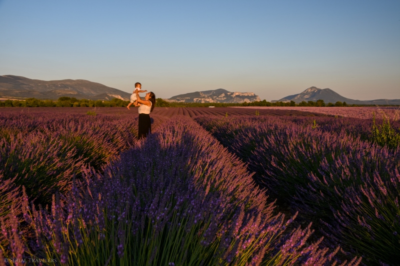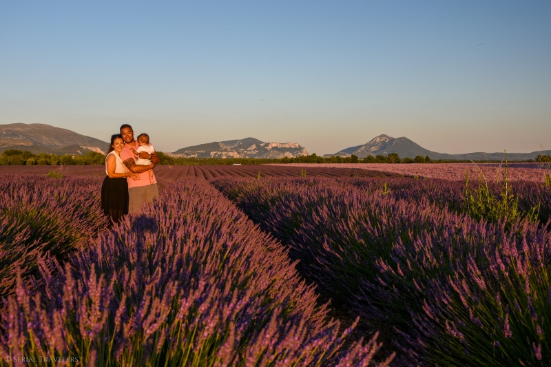 En fin de journée vers 17H, nous repasserons par le premier champ de lavande du début, profitant d’une lumière plus basse et de couleurs plus chaudes qu’à notre arrivée. C’est ici que nous ferons nos plus belles photos de jour, sur le plateau 🙂 Après une pause goûter pour bébé, nous repartirons en direction du village d’Aiguines, que nous atteindrons peu avant 18H.