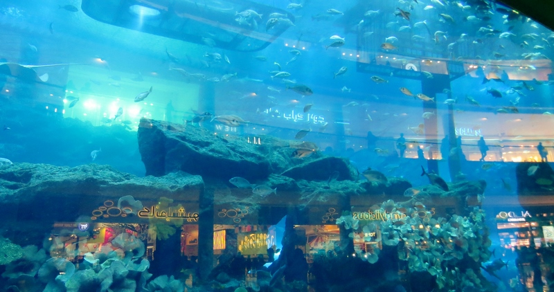 - The Dubaï Mall : plus grand centre commercial du monde, il est situé au pied du Burj Khalifa et offre une vue imprenable sur les fontaines depuis le restaurant TGIF (demandez à manger en terrasse pour observer le spectacle des fontaines de nuit). En plus du nombre impressionnant de boutiques, ce centre commercial dispose de plusieurs attractions ludiques telles qu’un aquarium géant ainsi qu’un véritable squelette de diplodocus. Faire ses emplettes au Dubaï Mall peut rapidement se présenter comme une sortie ludique, et oui !