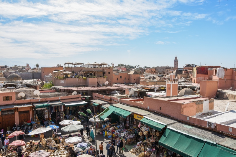 - Jour 1 : Départ de Paris à 7H et arrivée à Marrakech à 11H – Balade dans la médina de Marrakech (quartier des tanneurs & Medersa Ben Youssef) – Place Jemaa-El-Fna en soirée