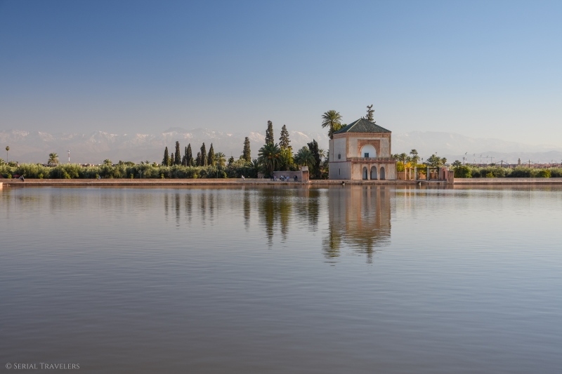 La Ménara de Marrakech est un vaste jardin de 88 hectares planté d’oliviers, situé entre l’aéroport et le nouveau quartier de l’Hivernage, à l’Ouest de la médina. Créé par l’architecte et savant Andalou Haij ibn Yaïch de Malaga, le jardin dispose d’un immense bassin servant notamment à l’irrigation de l’oliveraie. Bâtis dès l’époque Almohade sur l’ordre du calife Abdelmoumen Ben Ali Algoumi en 1157, les Jardins de la Ménara font partie des plus anciens jardins de l’Occident musulman ! L’alimentation en eau du bassin central (200 x 150 m) se fait grâce à un système hydraulique datant de l’époque Almohade, exploitant les nappes souterraines ainsi que l’eau des montagnes de l’Atlas, situées à 30 km de là ! Situés à 45 minutes à pied de la médina, les Jardins de la Ménara sont prisés des Marrakchis qui s’y promènent en famille en fin de journée et malgré la beauté des lieux, nous étions les seuls touristes sur place 🙂