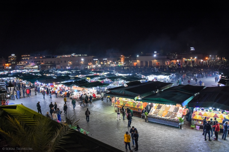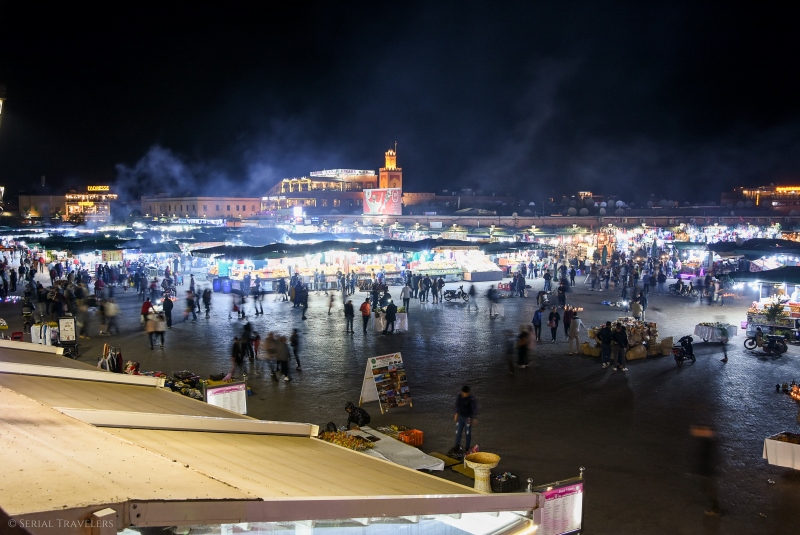 Donnant directement sur le souk et la mosquée Koutoubia, la place Jemaa-El-Fna (place des trépassés, en arabe) est sans conteste « the place to be » à Marrakech ! Cette célèbre place publique & populaire se situe au Sud-Ouest de la médina et est inscrite au patrimoine mondial de l’UNESCO depuis 1985. Il s’agit tout simplement de l’endroit le plus animé de la ville, de jour comme de nuit ! On y trouve en vrac : charmeurs de serpents, vendeurs de jus de fruit, stands de restauration, vendeurs de babioles… La place est ainsi l’une des principales attractions traditionnelles et historiques du tourisme marocain, puisqu’elle attire plus d’un million de touristes chaque année et près de 10 000 couverts sont servis sur cette esplanade chaque jour !