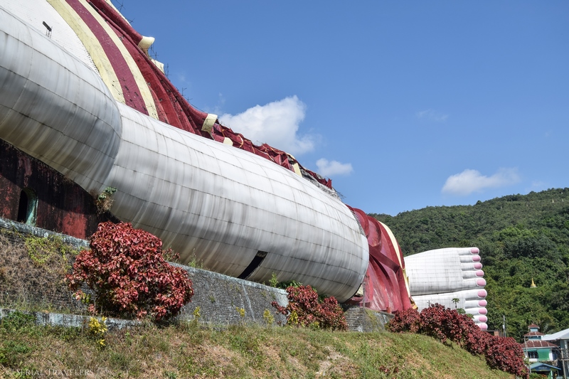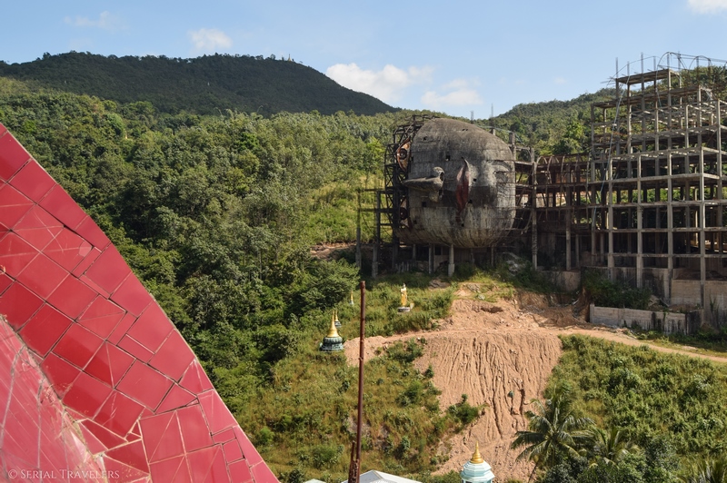 Le plus grand Bouddha du monde (plus de 180 mètres de long) est en effet encore en construction et le comble dans cette histoire, c’est que face à lui, un autre Bouddha géant est en train d’être construit tête bêche (on ne voit que l’ossature en béton pour le moment) ! Les travaux sont pour le moment suspendus par manque de budget… Ce sont donc les donations des fidèles qui permettent la fin de la construction, mais au rythme où vont les offrandes, il n’est pas encore prêt d’être terminé !