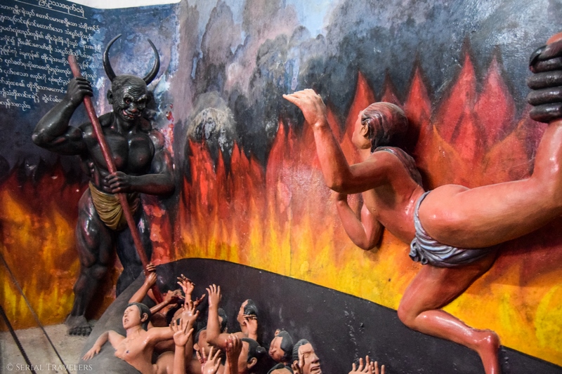 À l’intérieur, sur trois niveaux on trouve des dioramas représentant respectivement les Enfers, le Paradis et la vie terrestre, selon le bouddhisme. Des scènes parfois assez déconcertantes ! Bon, on doit dire que la visite est assez décevante et complètement vide de spiritualité ou de quelconque beauté. À l’intérieur, c’est simple il n’y a que du béton partout et c’est assez moche !