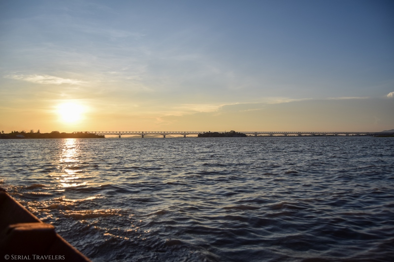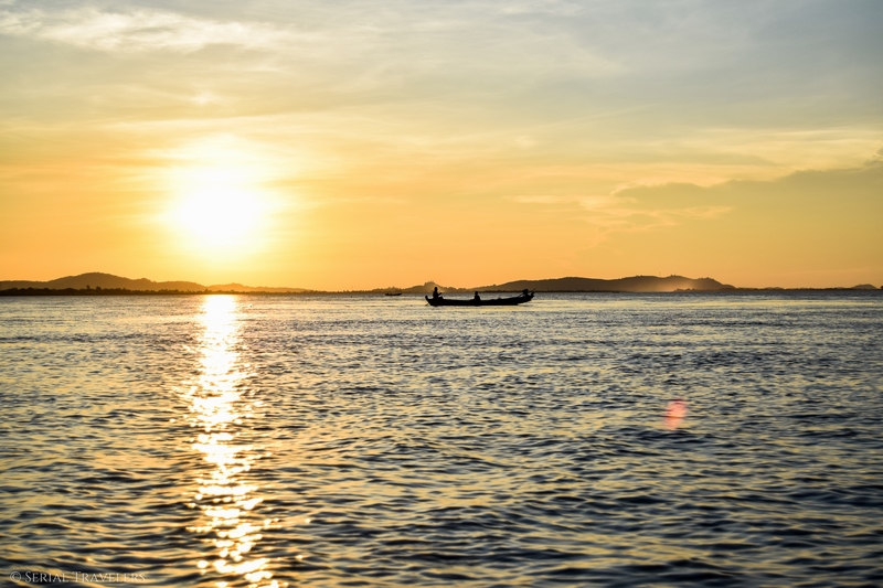 Arrivés à Moulmein, les bâtiments face à la rivière sont assez délabrés et ne donnent pas vraiment envie… On assiste tout de même à un très joli coucher de soleil malgré tout depuis le bateau, avant d’être débarqués sur une jetée flottante.