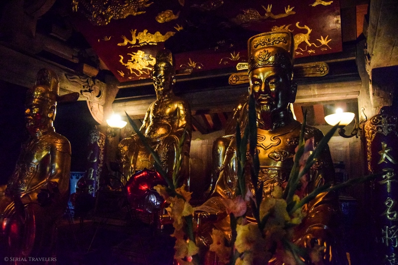 Nous marchons jusqu’au surprenant temple Thaï Vi, le premier du genre que nous découvrons. Et oui, il n’a rien à voir avec les autres temples que nous visitons depuis des mois en Asie. Celui-ci est en effet noir et gris, avec une architecture bien particulière rappelant la Chine, ainsi que des statues de Confucius.
