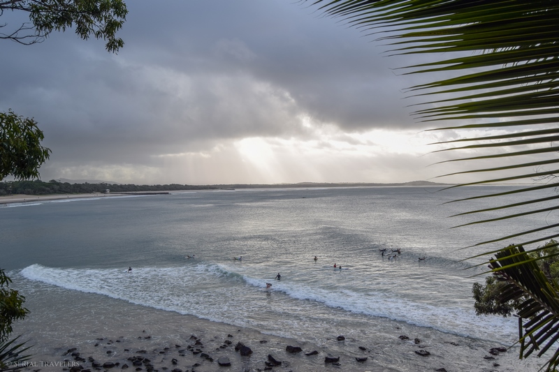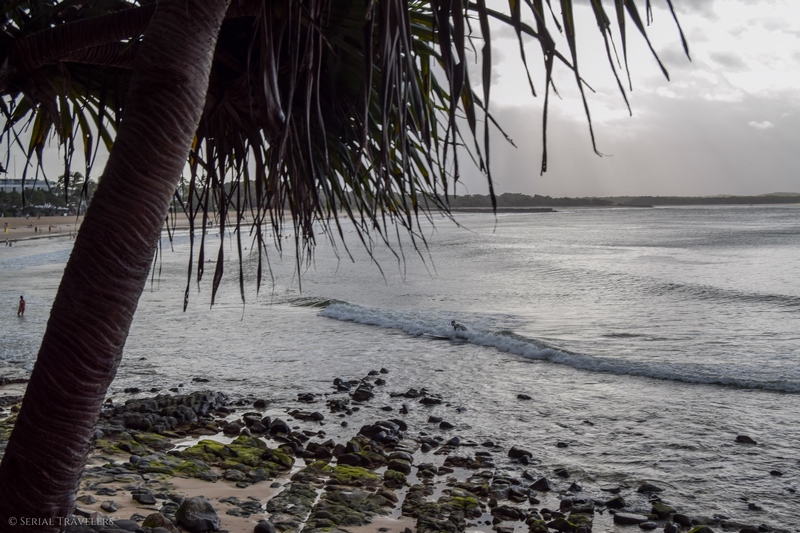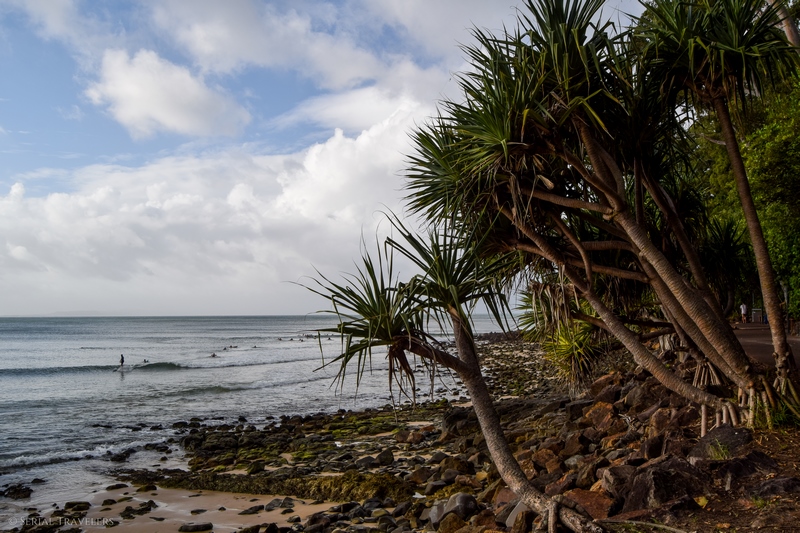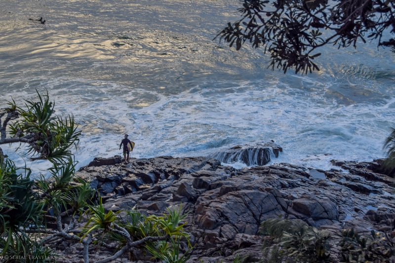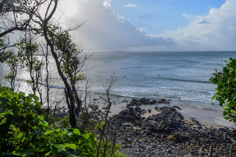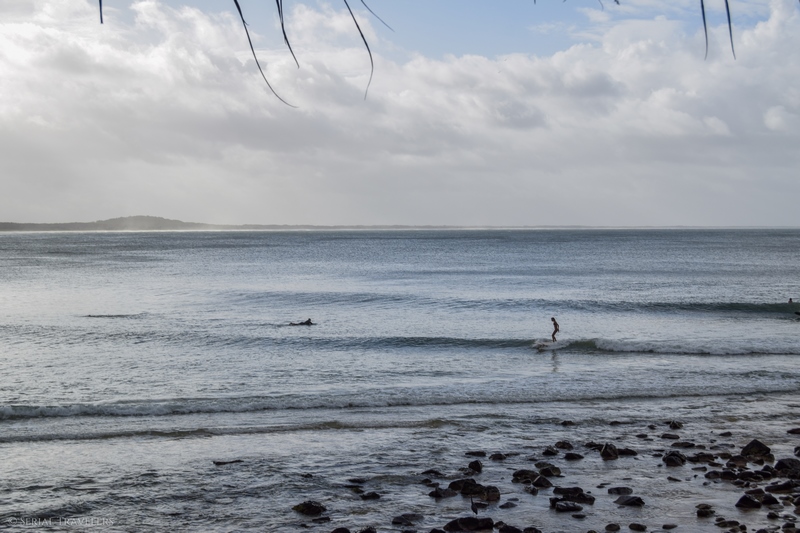 Nous démarrerons donc notre visite du Noosa NP en marchant depuis le parking jusqu’à la plage principale de Noosa Heads, qui possède la particularité d’être l’une des rares plages australiennes faisant face au Nord ! C’est sans conteste le meilleur endroit pour prendre des cours de surf (des planches sont en location) car les vagues sont de force modérée et la plage est surveillée toute l’année par des maître-nageurs. Nous verrons d’ailleurs de nombreux surfers en herbe s’essayer à la glisse ! Si nous n’étions pas arrivés si tard sur place, nous aurions sûrement succombé à l’envie d’apprendre à surfer !