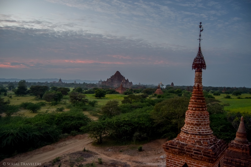 C’est en cherchant un peu plus que Thomas découvre deux passages (complètement dans le noir) sur la droite et la gauche de la salle principale, dès qu’on entre dans la pagode ! On y trouve en fait deux escaliers étroits qui permettent d’accéder au toit de la pagode, BINGO ! Arrivés à 16H au sommet, nous sommes absolument tous seuls ! Et c’est un véritable petit miracle pour un site aussi touristique que Bagan !