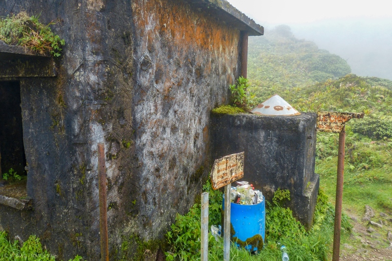 Après avoir bouclé la boucle autour de la caldeira, nous atteignons le troisième refuge, le plus proche du sommet réel de la Montagne Pelée (le Chinois, situé à 1 397 mètres d’altitude) et descendons dans le cratère du volcan par un escalier très raide ! Ici, les nuages sont omniprésents et l’humidité est telle que l’autofocus de l’appareil photo n’est plus efficace et nous obtiendrons des photos floues… La pluie revenant, on ne tentera pas le sommet du Chinois et descendrons par le même chemin qu’à l’aller pour retrouver notre voiture sur le parking, 5 heures plus tard !
