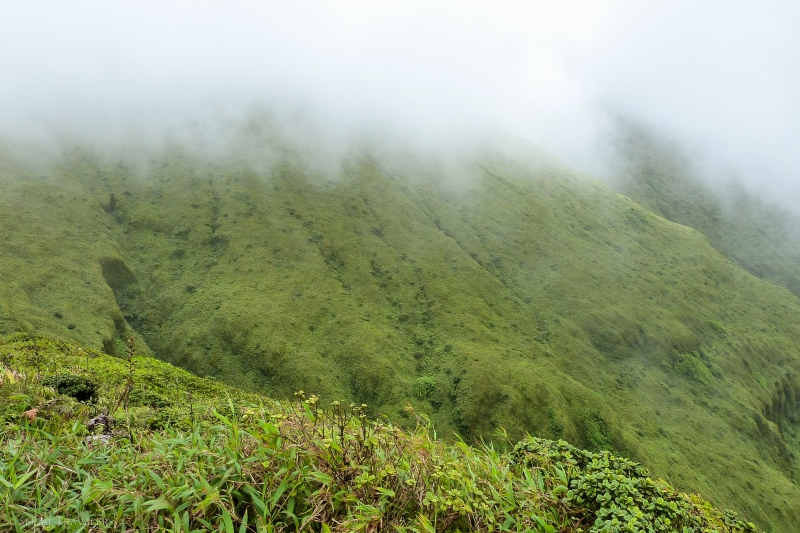 Malgré la météo pourrie, quelques personnes téméraires ont également eu la même idée que nous en osant venir défier le volcan par ce temps exécrable. Et pourtant, au fur-et-à mesure de la montée, la pluie finit par cesser et à certains moments, les nuages finissent par disparaître, nous laissant entrevoir la montagne et ses alentours.