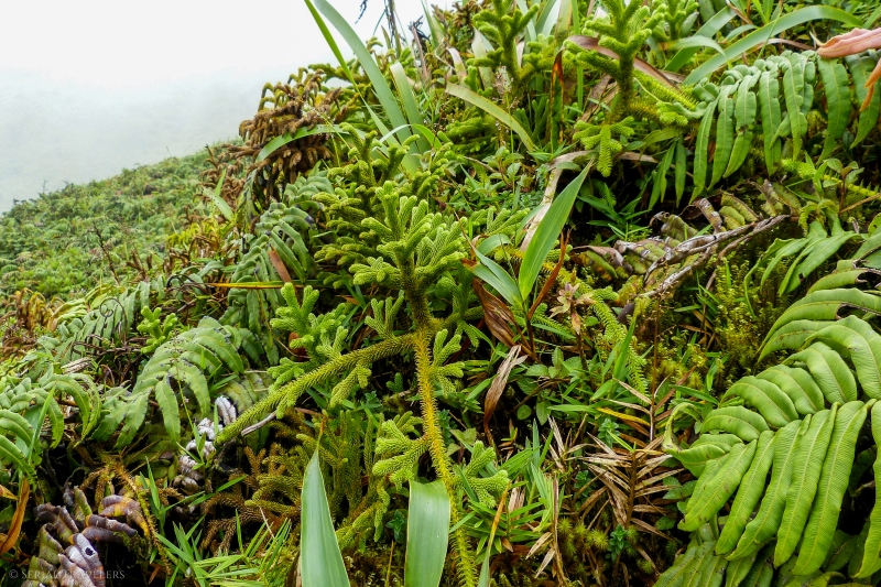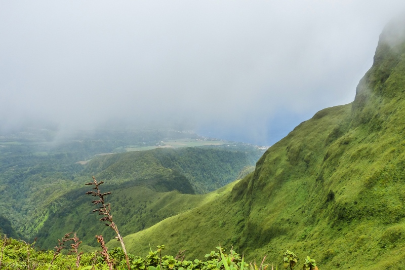 La montée jusqu’au deuxième refuge est une suite de hautes marches en bois, prises dans la montagne, parmi une végétation basse, composée entre autres de broméliacées et de fougères calumettes. La faune se compose quant à elle de quelques oiseaux comme des colibris ou des siffleurs de montagne, que nous n’aurons pas eu la chance de croiser. Arrivés au niveau du deuxième refuge, plusieurs choix se proposent à nous : l’arrivée des sentiers de Macouba et Grand-Rivière, la petite trace vers le Morne Lacroix et le sentier du tour de la caldeira.