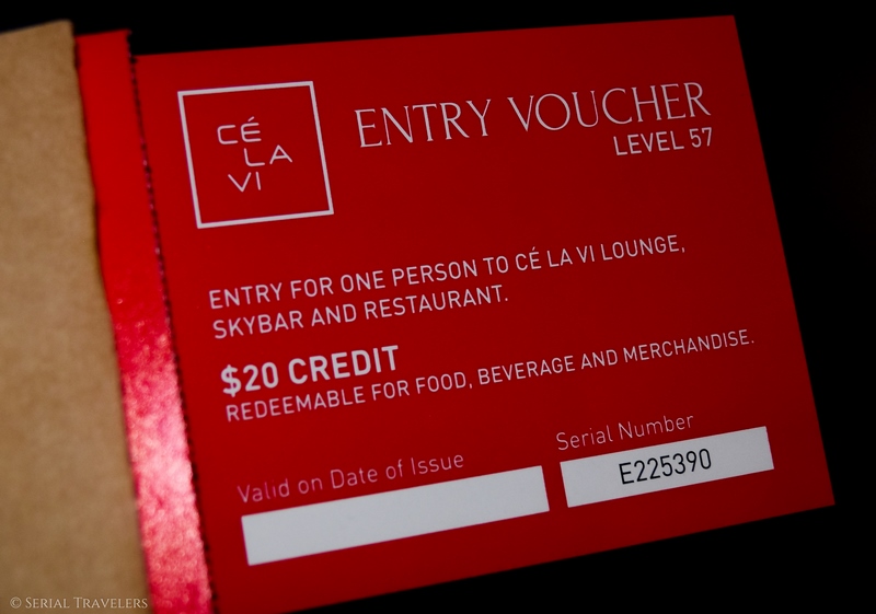 Le jeudi 24 août 2017, nous montons jusqu’au bar du rooftop via un ascenseur réservé aux clients du CE LA VI uniquement. Au pied de la troisième tour du Marina Bay Sands se trouve un guichet auprès duquel vous pouvez acheter un voucher pour consommer au bar du rooftop. Le montant minimum est de 20 S$ par personne (13 €), moins cher que les tickets d’entrée pour le 56ème étage et comprenant une consommation, elle est pas belle la vie ? Le 57ème étage est occupé par la piscine et par ce bar. Vous avez donc accès à l’ensemble du rooftop (côté proue ou avant du bateau uniquement) excepté la piscine.